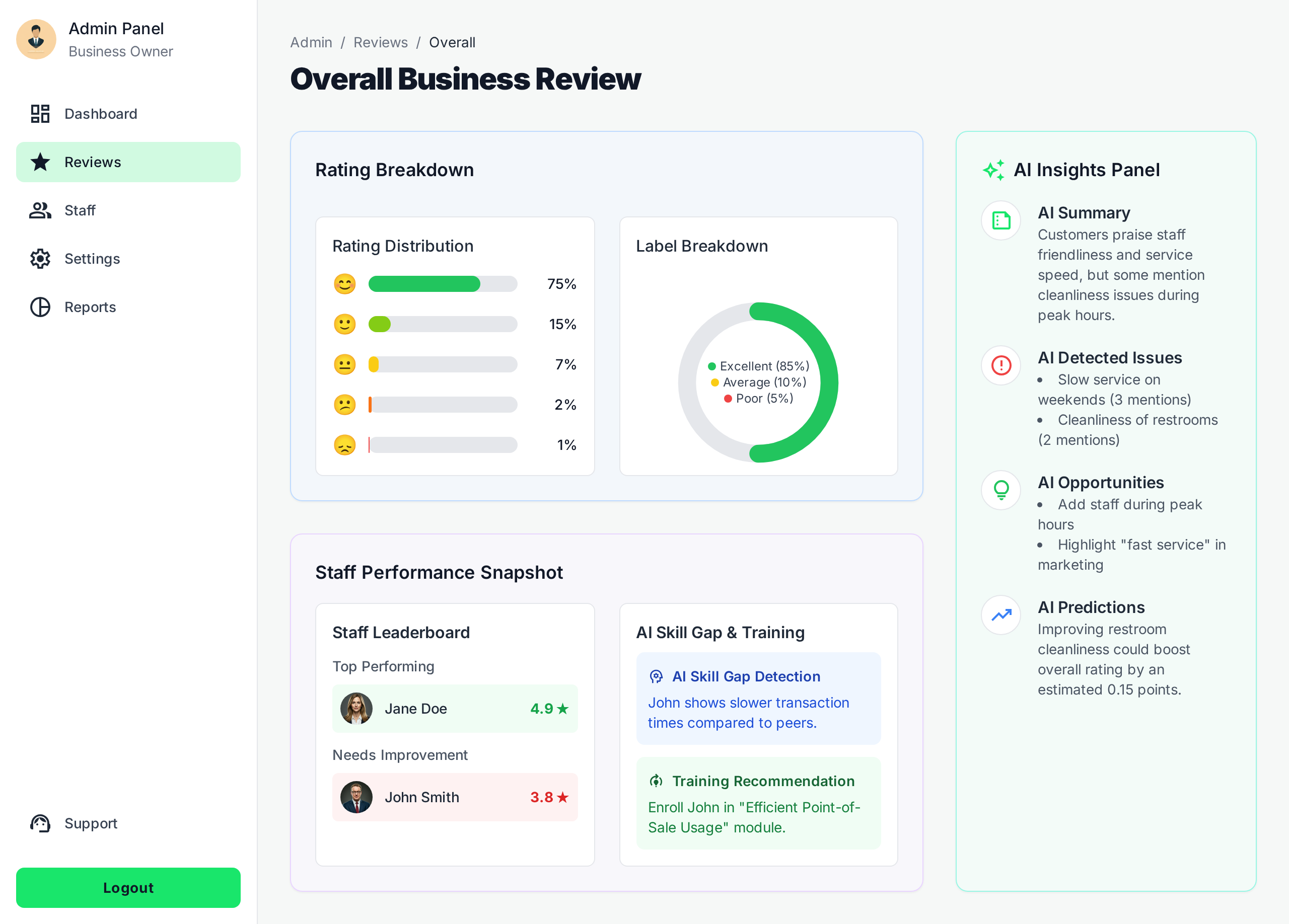 AI analyzes sentiment, detects issues, evaluates staff performance, and recommends improvements.